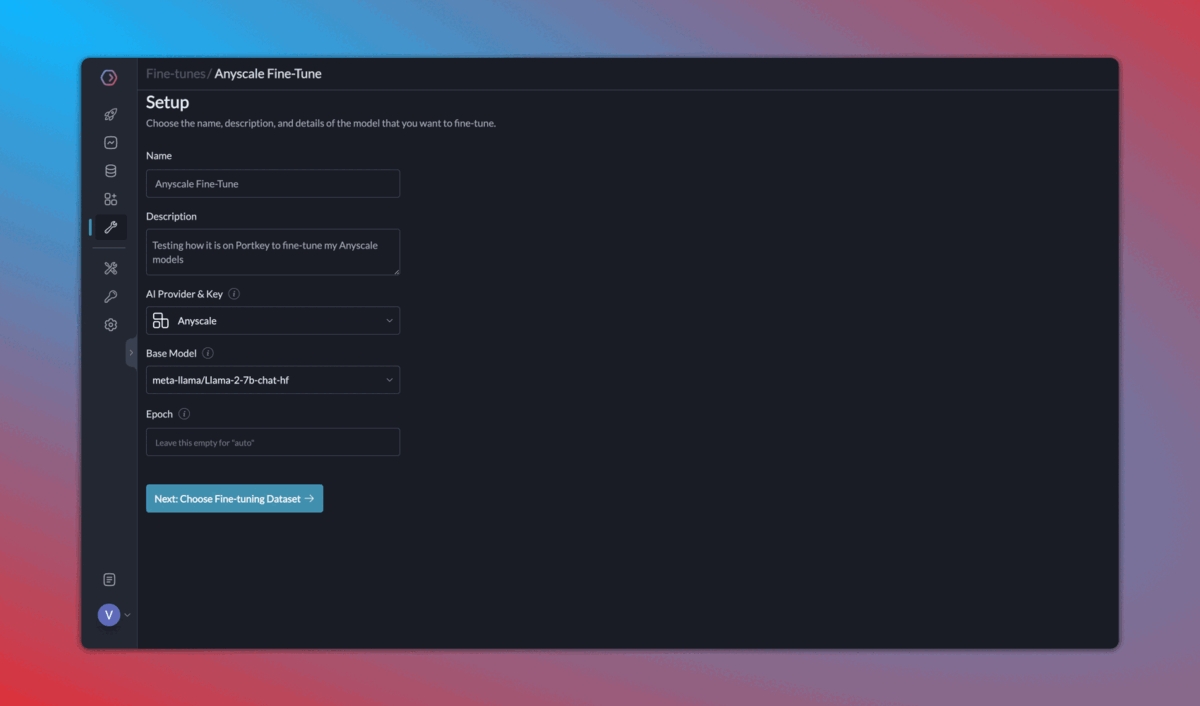 Fine-tuning is currently enabled for select orgs - please request access on Portkey Discord and we'll get back to you ASAP.